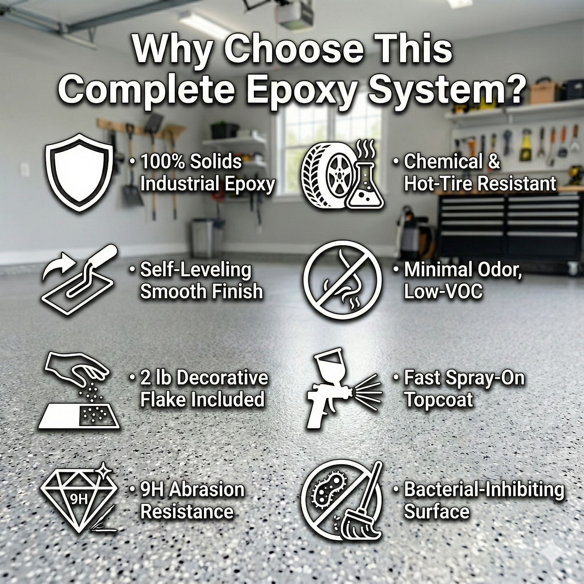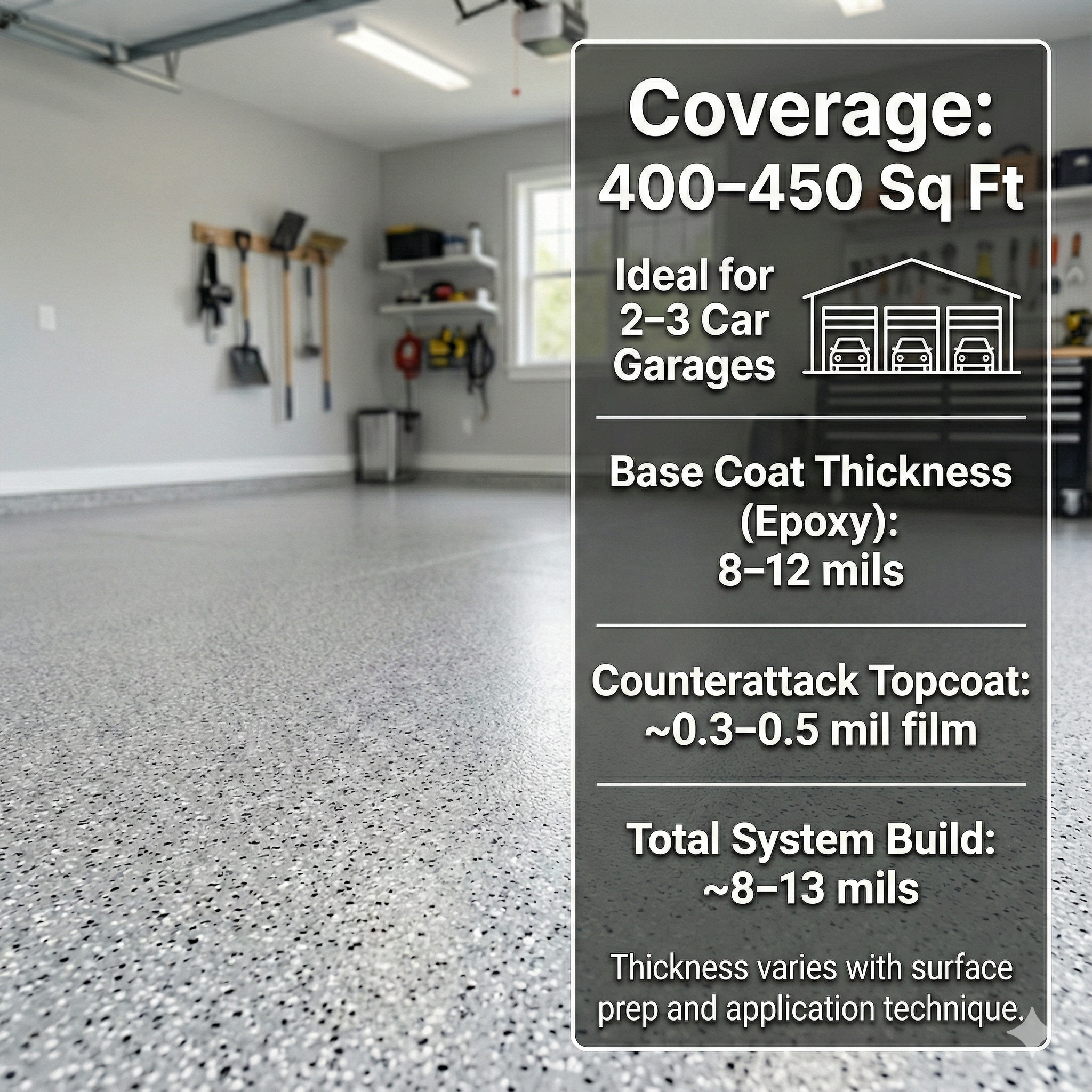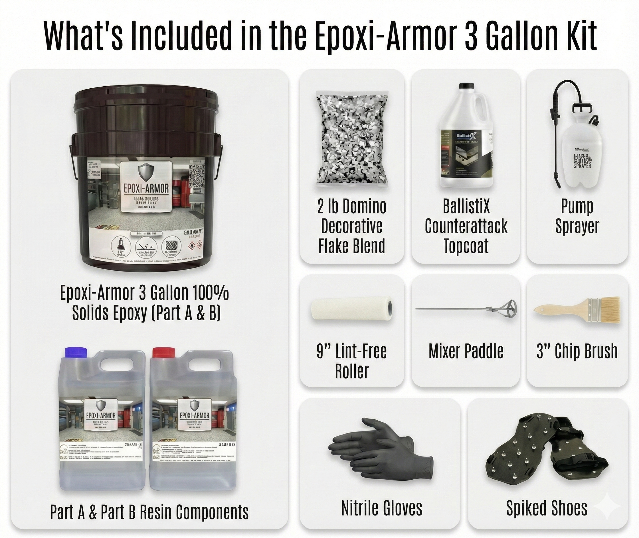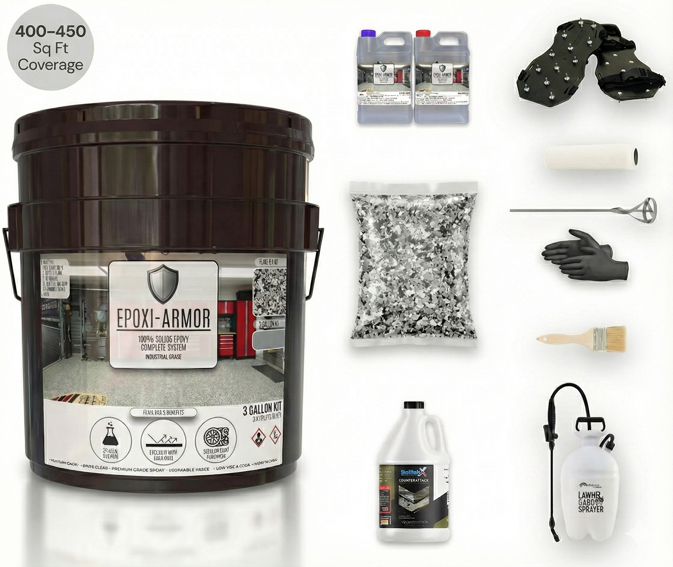 Roller, Mixer, Brush, Gloves, 2lb Flakes, Counterattack Topcoat, Pump Sprayer, Spiked Shoes – Garage, Basement – 400 SQFT Coverage
