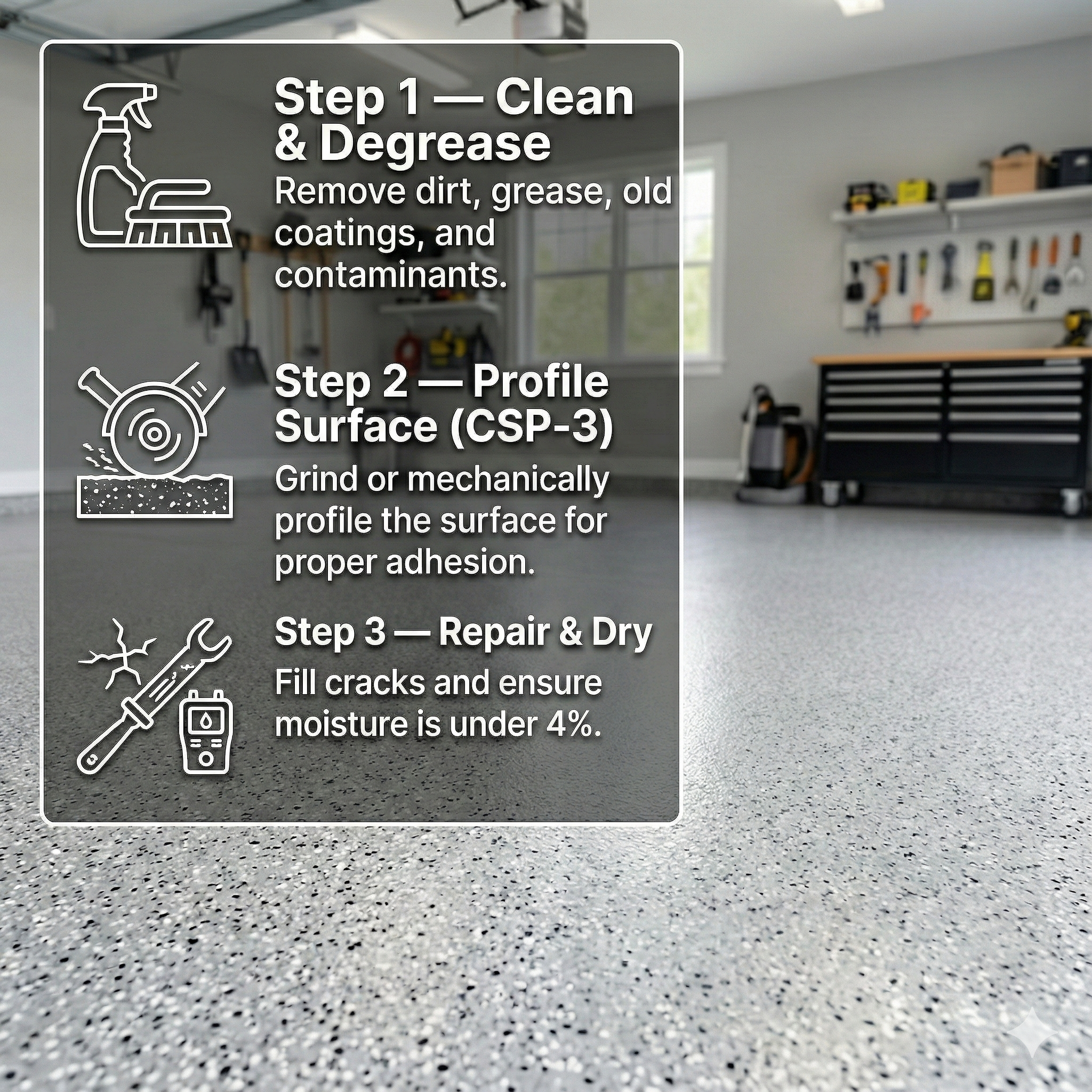 Clean – Remove all contaminants including dust, grease, coatings, delaminated layers, laitance, or any other substances that could impede or diminish adhesion.